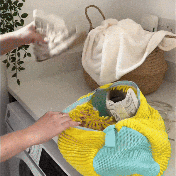 Place your dirty shoes (one pair per bag) with a capsule of your choice inside the bag. Close it securely, put it in the washing machine, and start the wash.